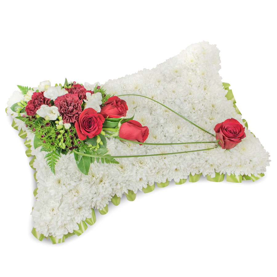 Express your heartfelt sympathy with our beautiful sympathy bouquet, carefully arranged to offer comfort and grace. This unique arrangement features a captivating mix of white chrysanthemums, stunning red roses, fragrant white freesias, deep dark red carnations, elegant dianthus, and soft bear grass.